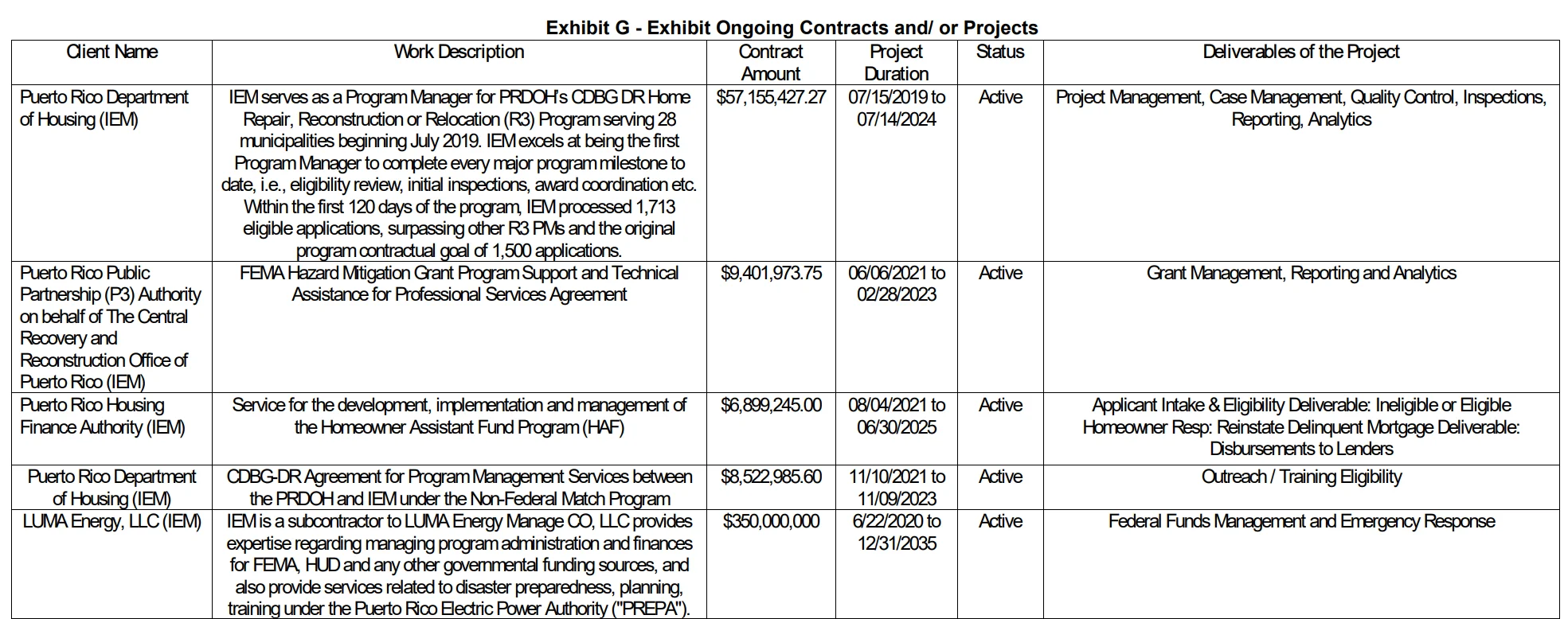 En las páginas 75, 76 y 77 del Exhibit G de dicha propuesta a DTOP, IEM reveló a existencia de los siguientes acuerdos contractuales, descripciones breves de las tareas asignadas y otros datos relacionados: