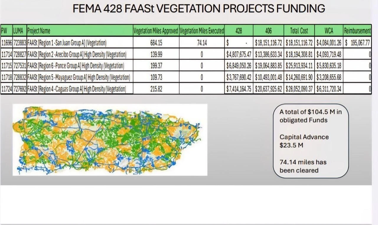 De acuerdo con un documento en poder de este medio, el cual ha sido discutido en reuniones oficiales desde la Fortaleza, la empresa ha solicitado adelantos de capital (“Working Capital Advance”) para iniciar las obras de despeje en al menos cinco regiones, incluyendo San Juan, además de contar con $104.5 millones en fondos ya obligados por FEMA bajo las secciones 428 y 406. Sin embargo y hasta la fecha, apenas ha ejecutado 74.14 millas de limpieza —equivalente apenas al 10% del total aprobado– y solo para el proyecto de la región de San Juan.