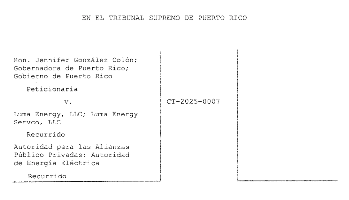 El Tribunal Supremo ordenó el archivo administrativo del recurso de certificación intrajurisdiccional presentado por la gobernadora Jenniffer González y el Gobierno contra LUMA Energy, luego de que la empresa notificara el traslado del pleito al Tribunal Federal para el Distrito de Puerto Rico.