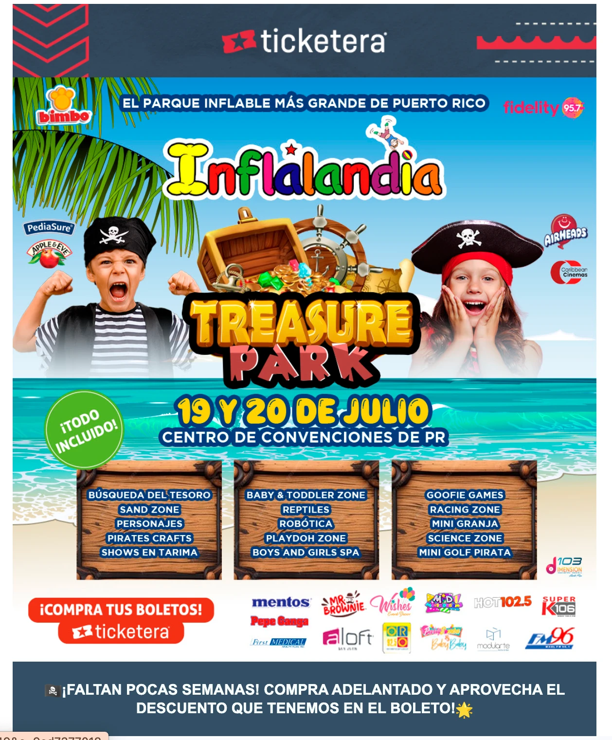 La "aventura pirata más épica" está por llegar a San Juan con el regreso de Inflalandia Treasure Park, el autodenominado parque inflable más grande de Puerto Rico. El evento familiar se llevará a cabo el 19 y 20 de julio en el Centro de Convenciones de Puerto Rico, prometiendo ocho horas de diversión continua con más de 60 atracciones incluidas en el precio del boleto.