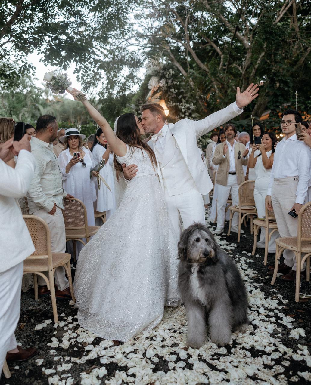 El evento reunió a los familiares más cercanos y amigos íntimos de la pareja, quienes compartieron con ellos este momento inolvidable. Valeria estuvo acompañada por sus padres, Víctor y Silvia Marín, y sus hermanos, Sebastián y Lander Marín. Por su parte, Julián celebró este día especial junto a dos de sus tres hijos, Nicolle y Juliancito, su nieto Oliver, y su inseparable perro Batman, quien se robó las miradas al encargarse de entregar los anillos.