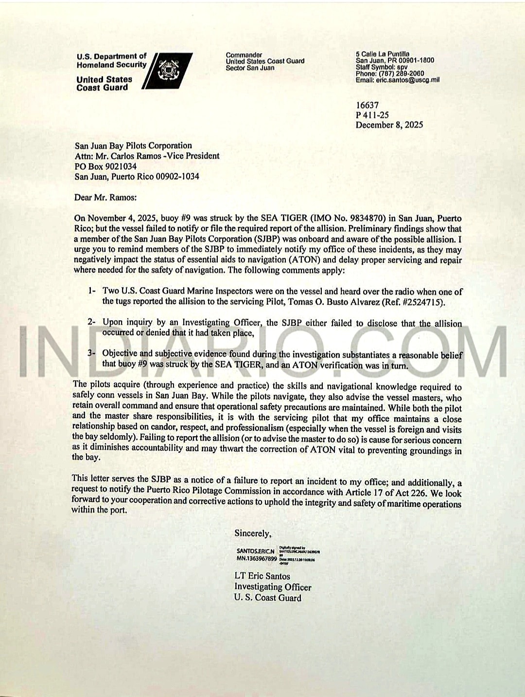 La información surge de una carta oficial fechada el 8 de diciembre de 2025 en poder de INDIARIO, firmada por el teniente Eric Santos, oficial investigador del Coast Guard, y dirigida al vicepresidente de la San Juan Bay Pilots Corporation, Carlos Ramos. En el documento, la agencia federal califica la omisión como un asunto de “seria preocupación” por sus implicaciones para la seguridad marítima.