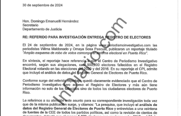 "En este momento, el Centro de Periodismo Investigativo no es objeto de investigación por parte del Departamento de Justicia en lo que concierne al referido recibido de parte de la Comisión Estatal de Elecciones”.