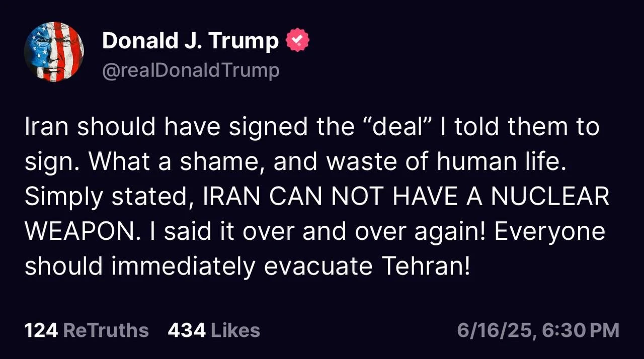 Mientras las tensiones en Washington sugieren una escalada inminente, Donald Trump publicó un mensaje contundente a “evacuar Teherán inmediatamente”