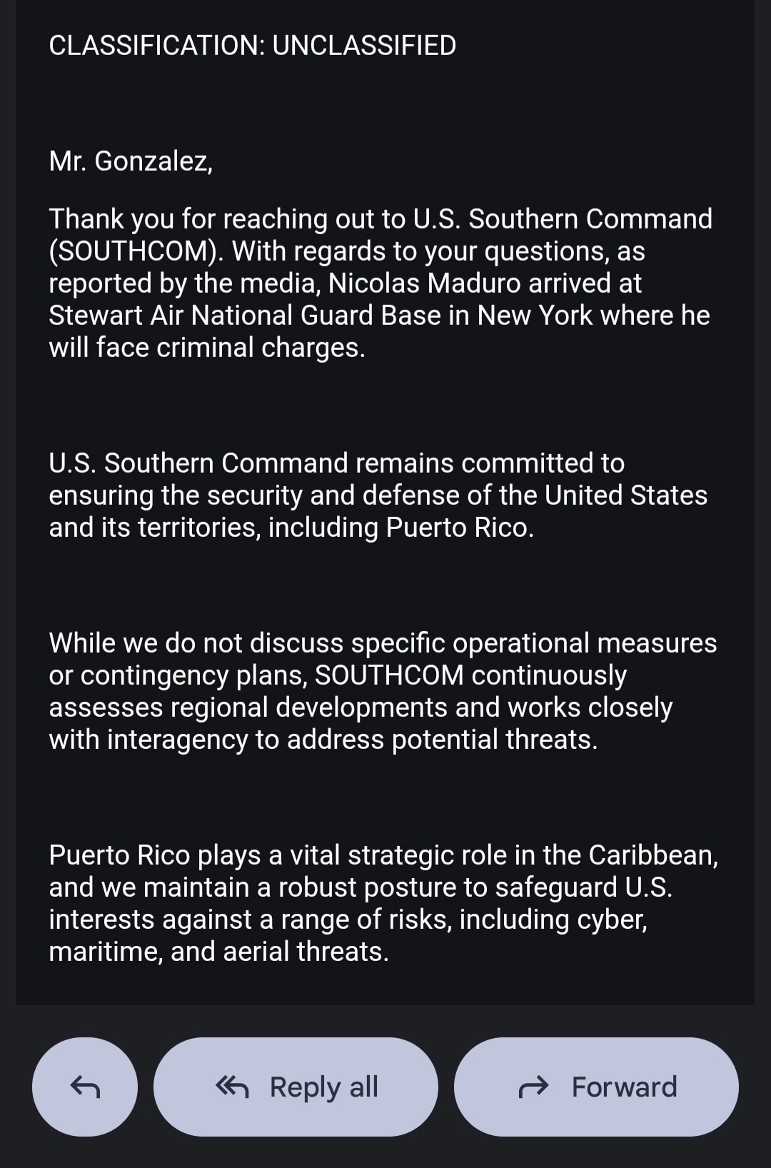La respuesta oficial de uno de sus portavoces de prensa surge luego de que la gobernadora Jenniffer González Colón indicara a periodistas en conferencia ante los medios desde Juana Díaz que las interrogantes relacionadas con el tema debían dirigirse al Departamento de Defensa (DoD, en inglés) En ese contexto es que se cursó un requerimiento formal de información tanto al DoD como a su división SOUTHCOM. Este último respondió a las 6:55 de la tarde, minutos luego de que el mundo viera a Maduro pisar suelo estadounidense escoltado por una gran cantidad de agentes federales al desembarcar un avión militar en el Stewart Air National Guard Base de Nueva York.