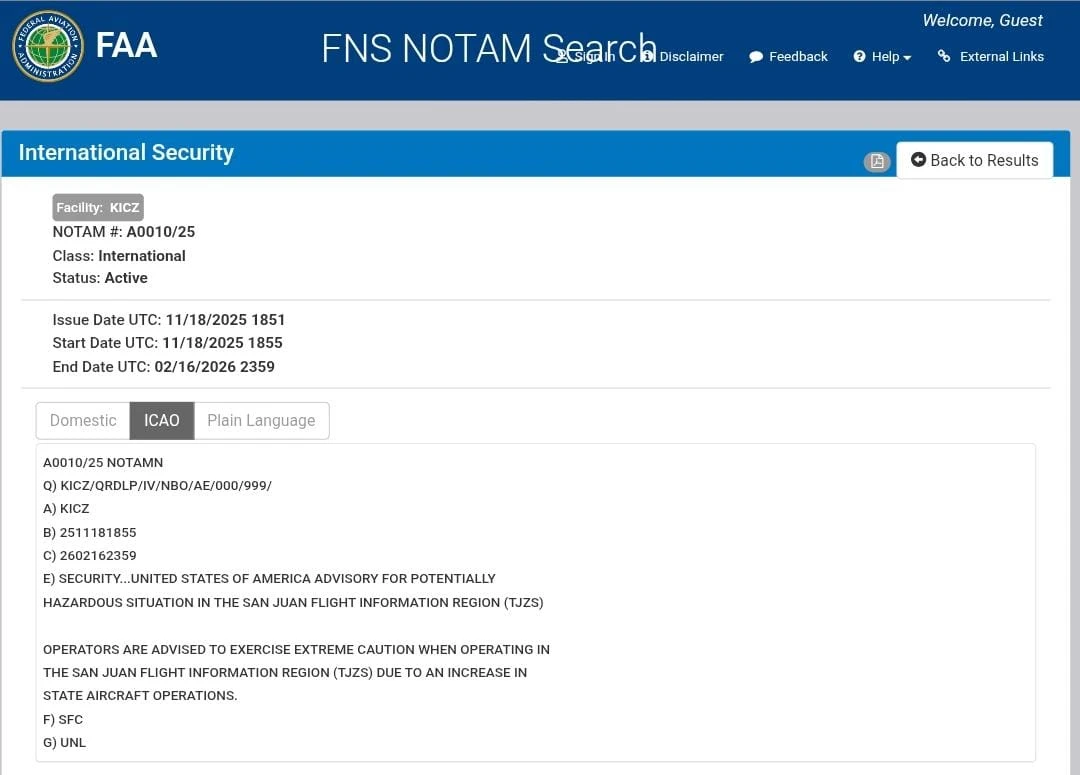 El aviso fue activado a las 18:55 UTC del 18 de noviembre y permanecerá vigente hasta el 16 de febrero de 2026. Se trata de una categoría de NOTAM poco común en el Caribe, especialmente porque proviene de la división de International Security de la FAA, que usualmente emite este tipo de mensajes para zonas donde existe actividad militar inusual, riesgos geopolíticos o potenciales amenazas a la navegación aérea civil.
