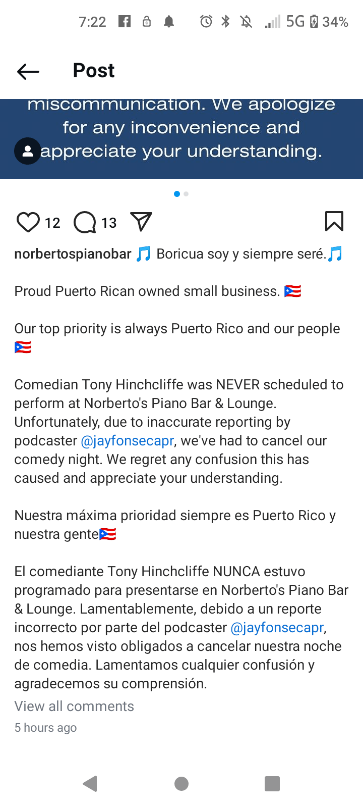 "Nuestra máxima prioridad siempre es Puerto Rico y nuestra gente 🇵🇷. El comediante Tony Hinchcliffe NUNCA estuvo programado para presentarse en Norberto's Piano Bar & Lounge. Lamentablemente, debido a un reporte incorrecto por parte del podcaster @jayfonsecapr, nos hemos visto obligados a cancelar nuestra noche de comedia. Lamentamos cualquier confusión y agradecemos su comprensión", publicaron en sus redes sociales sin ofrecer mayores detalles.