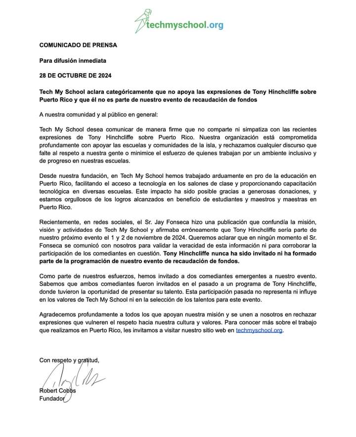 "Somos un negocio familiar y puertorriqueños y nunca contrataríamos a alguien tan bajo y repugnante", indicaron en su publicación. Además, aclararon que Tech My School tampoco contrató al comediante.