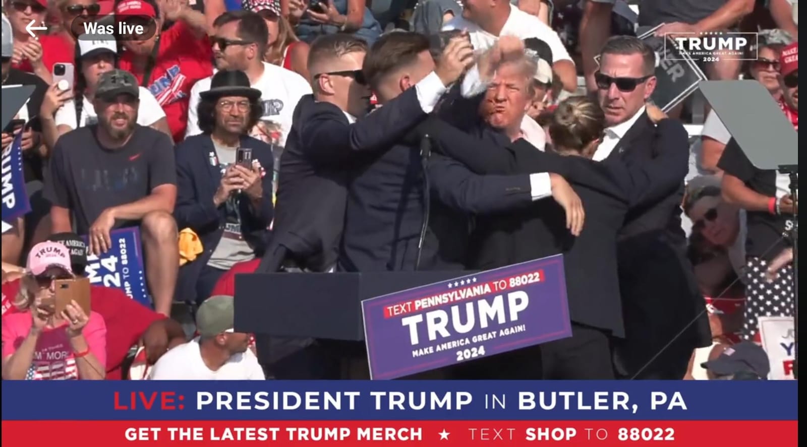 Cinco minutos luego de Trump iniciar su discurso, se escucharon lo que parecen ser disparos, para luego observarlo tocarse el lado derecho de su cabeza, cubrirse abajo del podio y ser socorrido por agentes del Servicio Secreto. El exmandatario fue desalojado casi de inmediato del lugar.