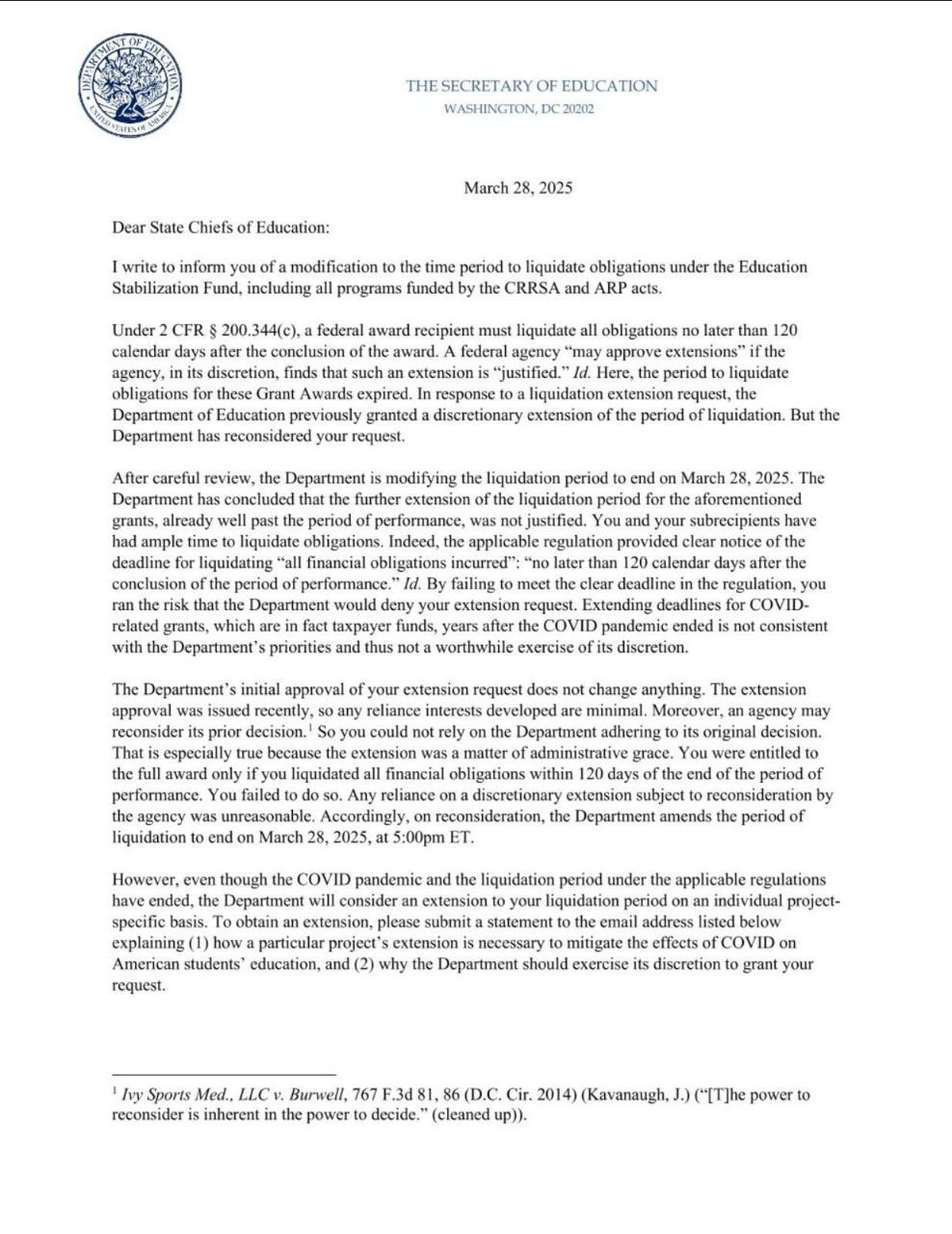 En una carta dirigida a los jefes estatales de educación que han incumplido con el uso de dichos fondos —incluyendo a Puerto Rico— la secretaria de Educación federal Linda McMahon recordó que, bajo la regulación 2 CFR § 200.344(c), las agencias receptoras de fondos federales estaban obligadas a liquidar todas las obligaciones dentro de un plazo de 120 días desde el fin del periodo de ejecución del fondo.