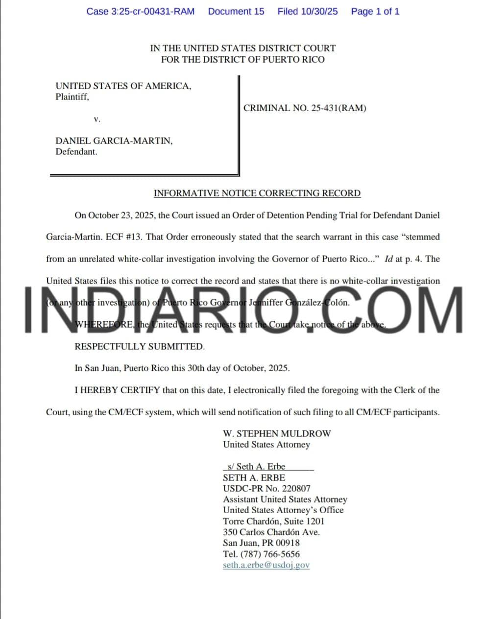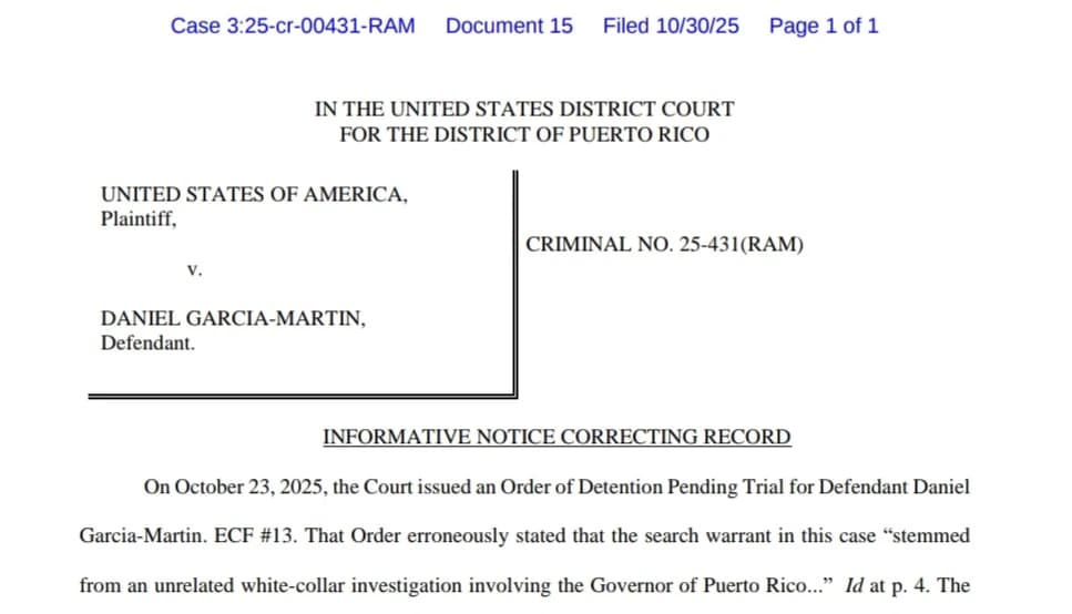 En una moción titulada “Informative Notice Correcting Record” presentada ante el Tribunal Federal, el fiscal W. Stephen Muldrow explicó que la orden de detención emitida el 23 de octubre por el magistrado Marshall Morgan contenía un error al afirmar que el allanamiento a García Martín “derivó de una investigación de cuello blanco no relacionada que involucra a la gobernadora de Puerto Rico y a una propiedad que pertenece a su familia”.