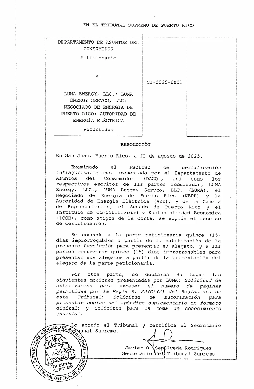 En una resolución notificada esta tarde, el Supremo concedió al DACO un término de quince días improrrogables para presentar su alegato, y a las partes recurridas —LUMA, el NEPR y la AEE— igual término de quince días una vez recibido el escrito de la agencia. También comparecen como amicus curiae la Cámara de Representantes, el Senado de Puerto Rico y el Instituto de Competitividad y Sostenibilidad Económica (ICSE).