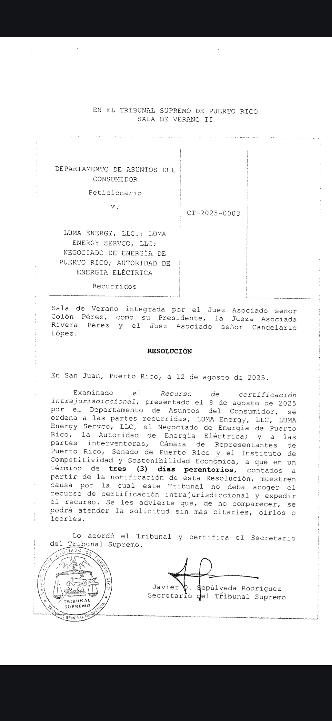 La Sala de Verano del Tribunal Supremo de Puerto Rico emitió una resolución en la que otorga un plazo de tres días a LUMA Energy, el Negociado de Energía de Puerto Rico (NEPR), la Autoridad de Energía Eléctrica (AEE) y las partes interventoras —Cámara de Representantes, Senado y el Instituto de Competitividad y Sostenibilidad Económica— para mostrar causa por la cual no debe acoger el recurso de certificación intrajurisdiccional presentado por el Departamento de Asuntos del Consumidor (DACO).recurso de certificación intrajurisdiccional presentado por el Departamento de Asuntos del Consumidor (DACO).