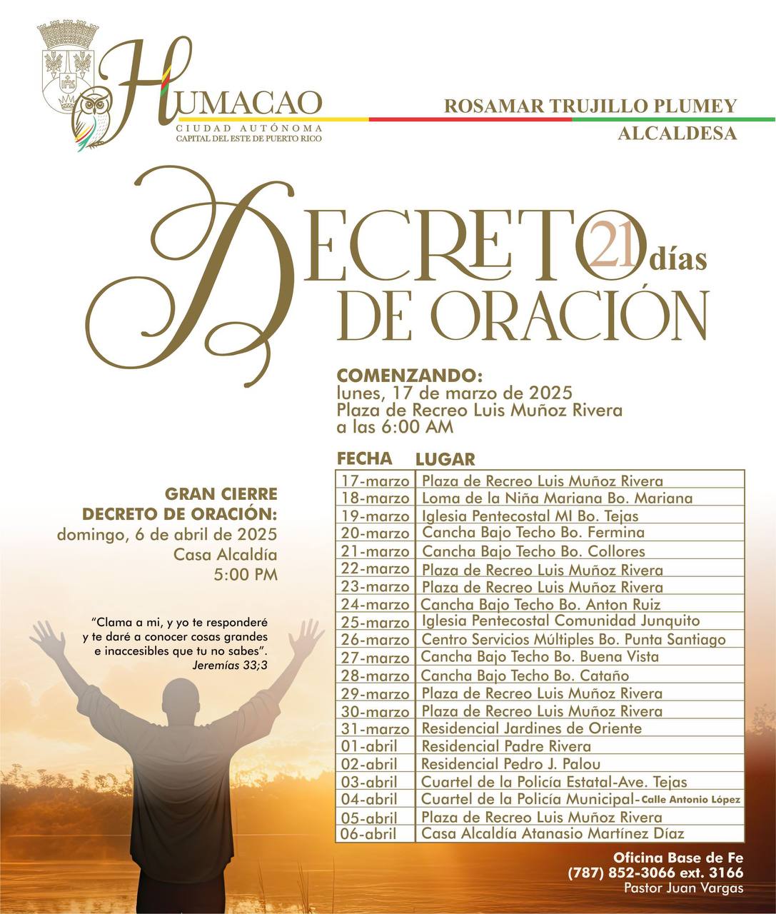 El decreto establece que, a partir del próximo lunes, 17 de marzo, hasta el domingo, 6 de abril de 2025, todos los ciudadanos que así lo deseen podrán unirse de manera voluntaria en momentos diarios de oración y reflexión desde las 6:00 hasta las 7:00 de la mañana. Estos encuentros se realizarán en diferentes sectores y barrios del municipio, fomentando la participación inclusiva y comunitaria. “Esta jornada espiritual iniciará mañana lunes, 17 de marzo, desde las 6:00 hasta las 7:00 de la mañana en la Plaza de Recreo Luis Muñoz Rivera y continuará durante los próximos 21 días en diversos sectores del municipio, culminando el domingo 6 de abril de 2025 con una actividad especial en la Casa Alcaldía a las 5:00 p.m. La base de nuestra nación nos llama a trabajar unidos por el bien común; estos días de oración serán una oportunidad para fortalecer esos lazos que nos identifican como humacaeños y como pueblo puertorriqueño”, expresó la alcaldesa.