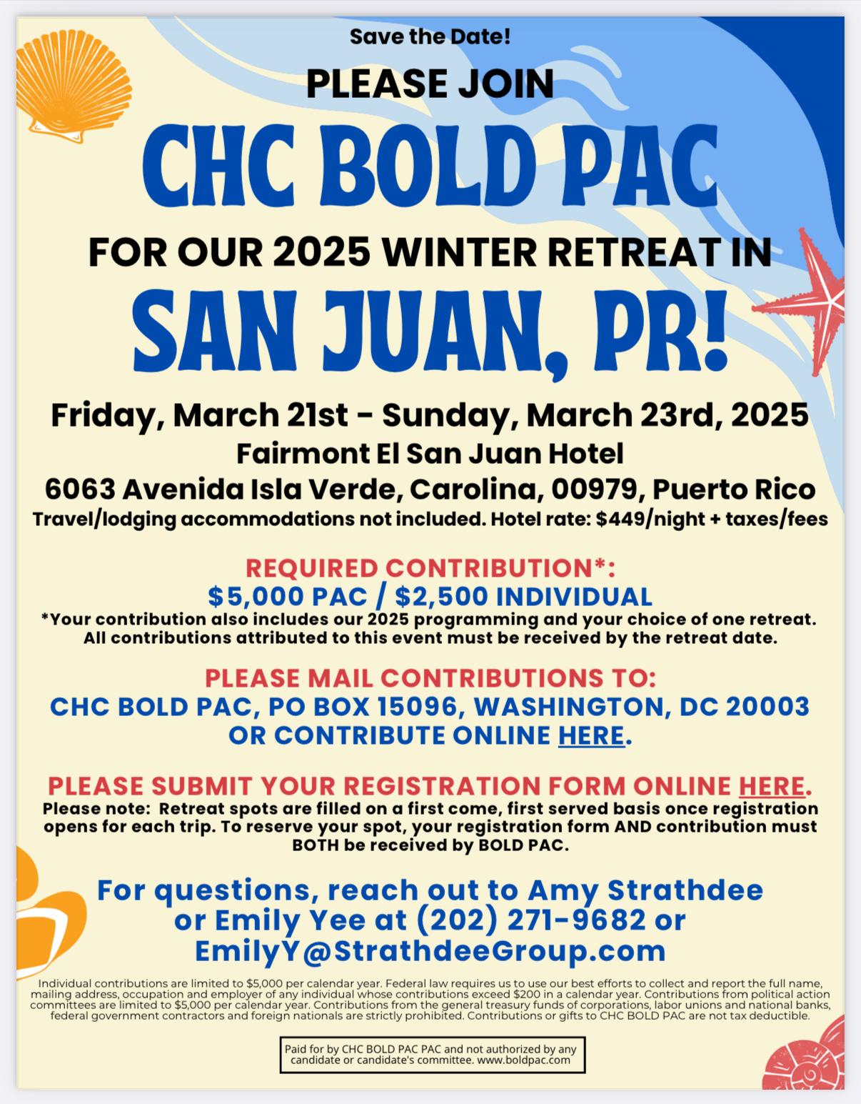 El BOLD PAC, brazo político del Congressional Hispanic Caucus, celebrará su retiro de invierno en Puerto Rico del viernes 21 al domingo 23 de marzo en el Fairmont El San Juan Hotel, en Carolina. La actividad busca recaudar fondos para apoyar las campañas de candidatos demócratas en Estados Unidos.