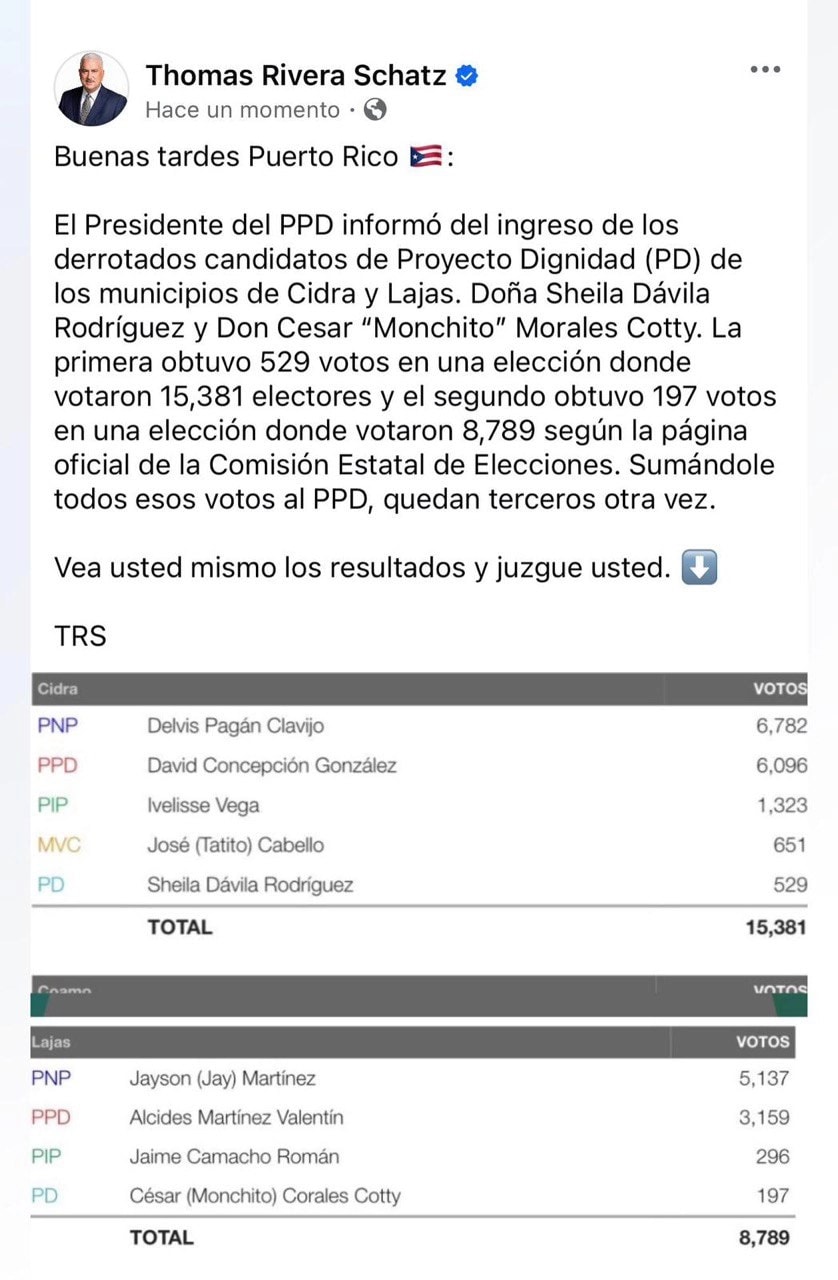 “El Presidente del PPD informó del ingreso de los derrotados candidatos de Proyecto Dignidad de los municipios de Cidra y Lajas… Sumándole todos esos votos al PPD, quedan terceros otra vez”, escribió Rivera Schatz en sus redes sociales, acompañando su mensaje con capturas de los resultados oficiales.