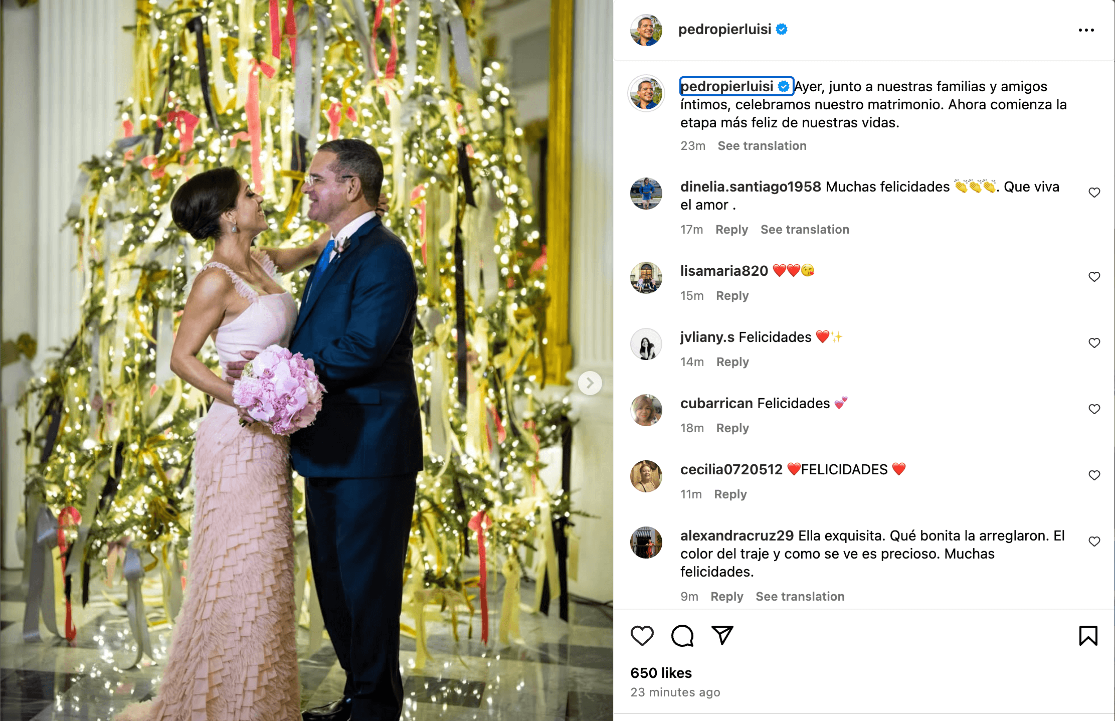 El matrimonio se llevó a cabo en un entorno reservado, rodeado de familiares y amigos íntimos, reflejando el tono discreto y personal que ambos han mantenido. Aunque no se han revelado detalles adicionales sobre la ceremonia, el mensaje compartido por Pierluisi deja entrever la alegría y emoción por este nuevo capítulo en su vida.