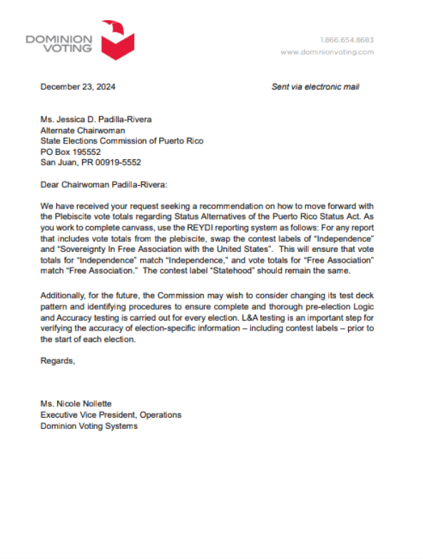 Seis días más tarde, Dominion oficializó la existencia del error en el etiquetado de los resultados del plebiscito celebrado bajo el Puerto Rico Status Act, donde los votos correspondientes a las opciones de "Independencia" y "Soberanía en Libre Asociación con los Estados Unidos" fueron reportados de forma invertida.