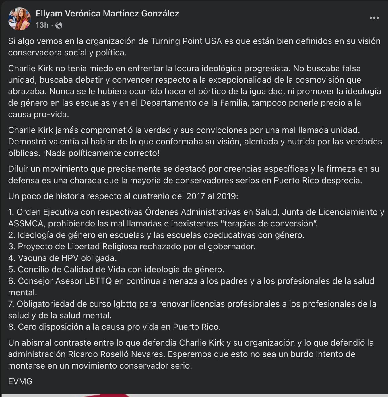 La publicación también incluyó un listado de medidas impulsadas durante el cuatrienio de 2017 a 2019, bajo la administración de Ricardo Rosselló Nevares, que —según Martínez— representaron la adopción de políticas contrarias a los valores conservadores y provida. Entre ellas mencionó: