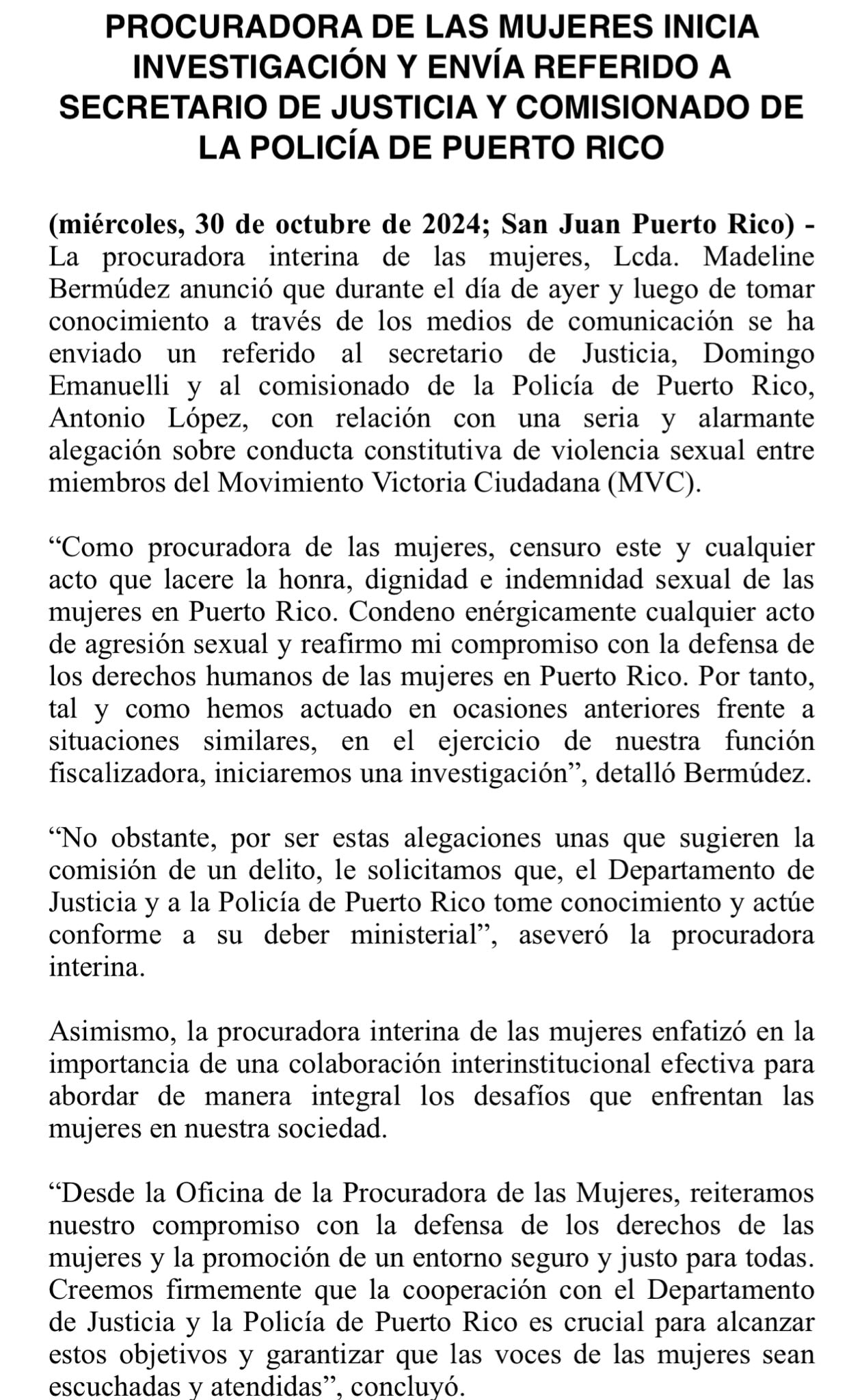 El Departamento de Justicia y la Policía de Puerto Rico investigarían el supuesto incidente luego de que una carta narrando los hechos fuera filtrada en redes sociales ayer, martes. Las entidades de ley y orden supieron de la situación luego de que la Oficina de la Procuradora de las Mujeres presentara un referido formal en ambas agencias, el cual fue suscrito por su procuradora interina, Madeline Bermúdez.