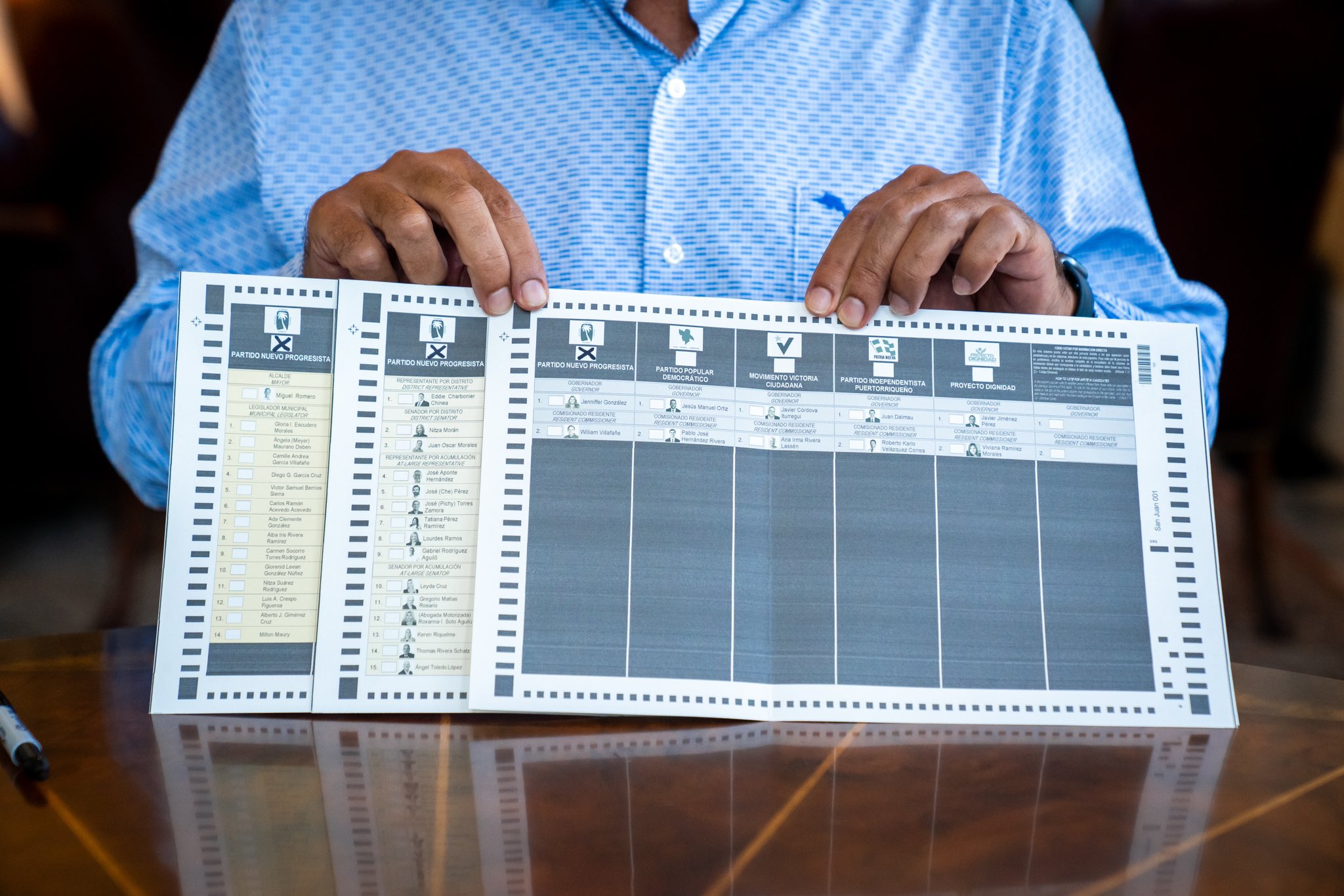 "Como buen estadista, hoy voté íntegro bajo la Palma en las tres papeletas y por la Estadidad que garantiza un futuro de Igualdad y Progreso para Puerto Rico. Esa es la mejor opción", indicó el mandatario en sus redes sociales. En declaraciones escritas, incluyó la imagen de su selección a la opción de la unión permanente de la isla con Estados Unidos y la de la papeleta presidencial simbólica entre la candidata demócrata Kamala Harris y el expresidente republicano Donald Trump.