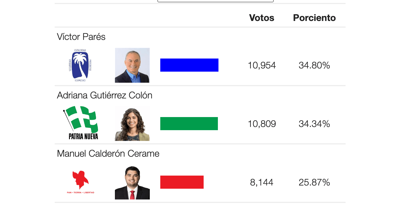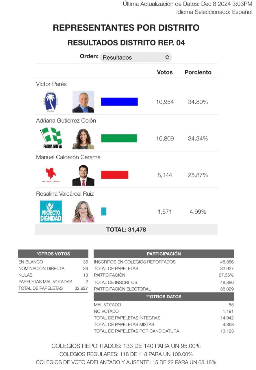 El Precinto 4 también confirma la tendencia, con Víctor Parés del PNP liderando con el 34.80% frente al 34.34% de Adriana Gutiérrez Colón del PIP. Gutiérrez había destacado durante su campaña que este distrito sería un ejemplo del avance de la Alianza, afirmación que ahora se ve desacreditada por los resultados.