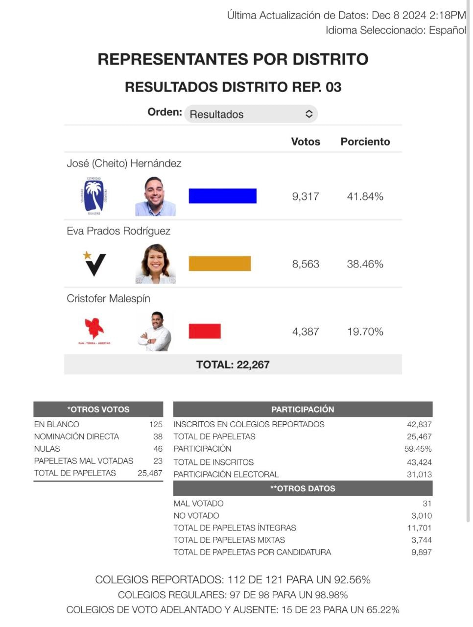 En el Precinto 3, José “Cheito” Hernández del PNP obtuvo un sólido 41.84% de los votos frente al 38.46% de Eva Prados Rodríguez del MVC. Prados había expresado en múltiples foros que “los sanjuaneros quieren un cambio estructural”, pero los números actuales muestran que ese cambio no se reflejó en las urnas.