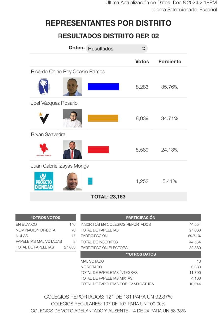 En el Precinto 2, Ricardo "Chino Rey" Ocasio Ramos del PNP lidera con el 35.76% de los votos, superando a Joel Vázquez Rosario del MVC, quien obtuvo el 34.71%. Este resultado contrasta con las declaraciones del comisionado electoral del PIP, Roberto Iván Aponte, quien había señalado que "la Alianza tiene grandes probabilidades de triunfar en San Juan.