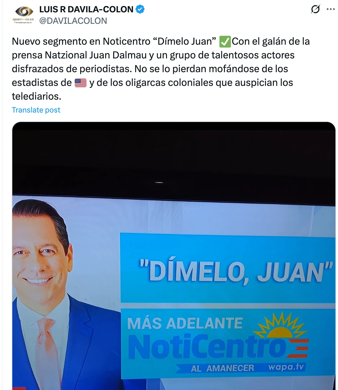 El anuncio de su nuevo segmento, "Dímelo, Juan", ya ha generado escepticismo. El veterano analista político Luis Dávila Colón reaccionó con ironía en sus redes sociales: "Nuevo segmento en Noticentro 'Dímelo Juan' ✅Con el galán de la prensa Natzional Juan Dalmau y un grupo de talentosos actores disfrazados de periodistas. No se lo pierdan mofándose de los estadistas de 🇺🇸 y de los oligarcas coloniales que auspician los telediarios."
