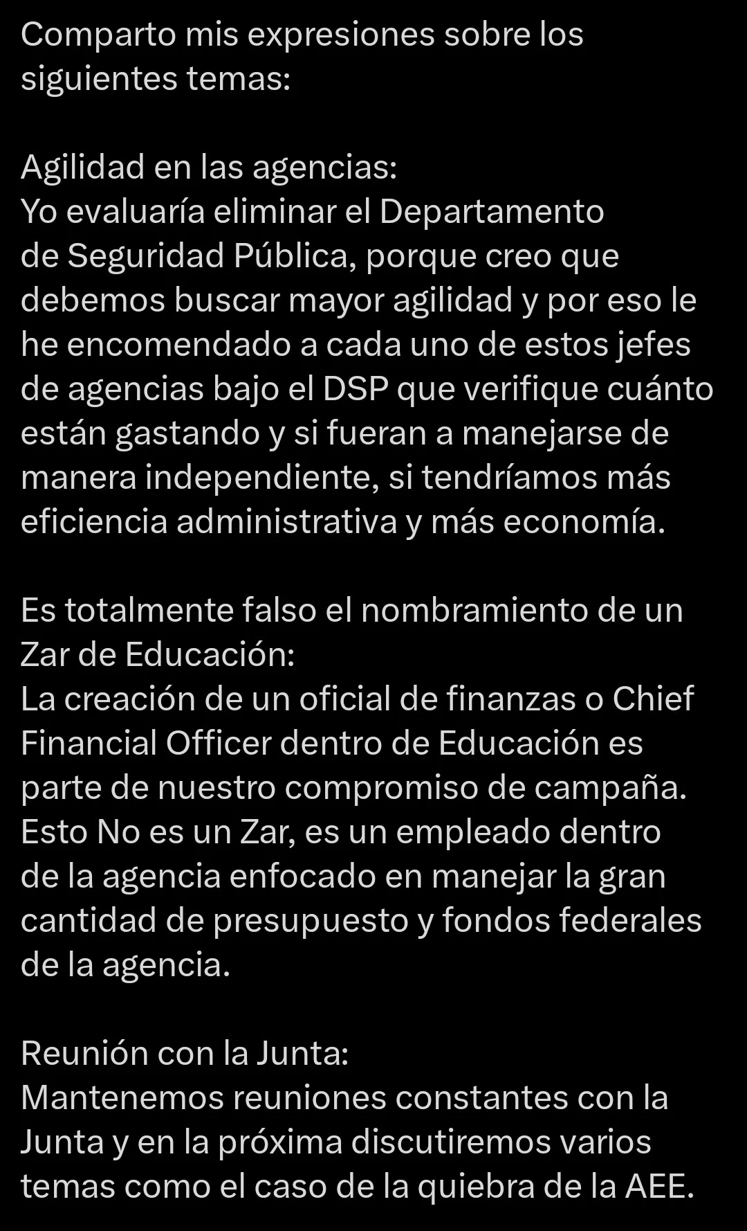 González Colón explicó que la plaza a la que se hace referencia corresponde a un oficial de finanzas o Chief Financial Officer dentro del Departamento de Educación. Según indicó, se trata de un puesto incluido en su plan de gobierno y destinado a manejar el presupuesto y los fondos federales de la agencia. INDIARIO verificó de manera independiente la información y confirmó que la aseveración coincide con la descripción para la posición.