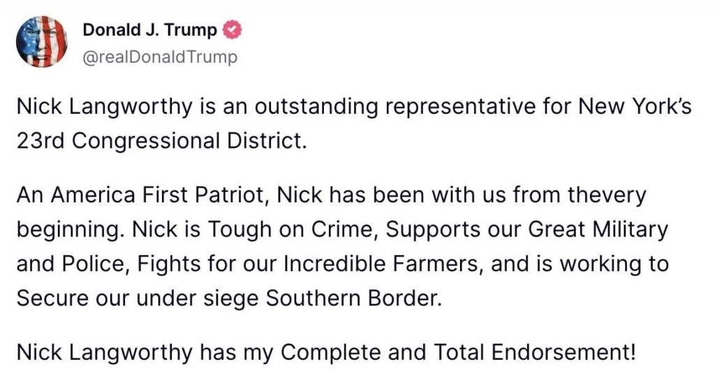 Antes de llegar a la Cámara de Representantes en enero de 2023, Langworthy fue presidente del Partido Republicano del estado de Nueva York. Asumió ese cargo en 2019, tras años al frente del comité republicano del condado de Erie. Su trayectoria como organizador partidista le dio acceso directo al liderato republicano y a redes de influencia dentro de la estructura del partido. Ese trasfondo ha sido parte de lo que le ganó el endoso contundente de Trump y que además le ha permitido incidir en asuntos que van más allá de los límites de su distrito.