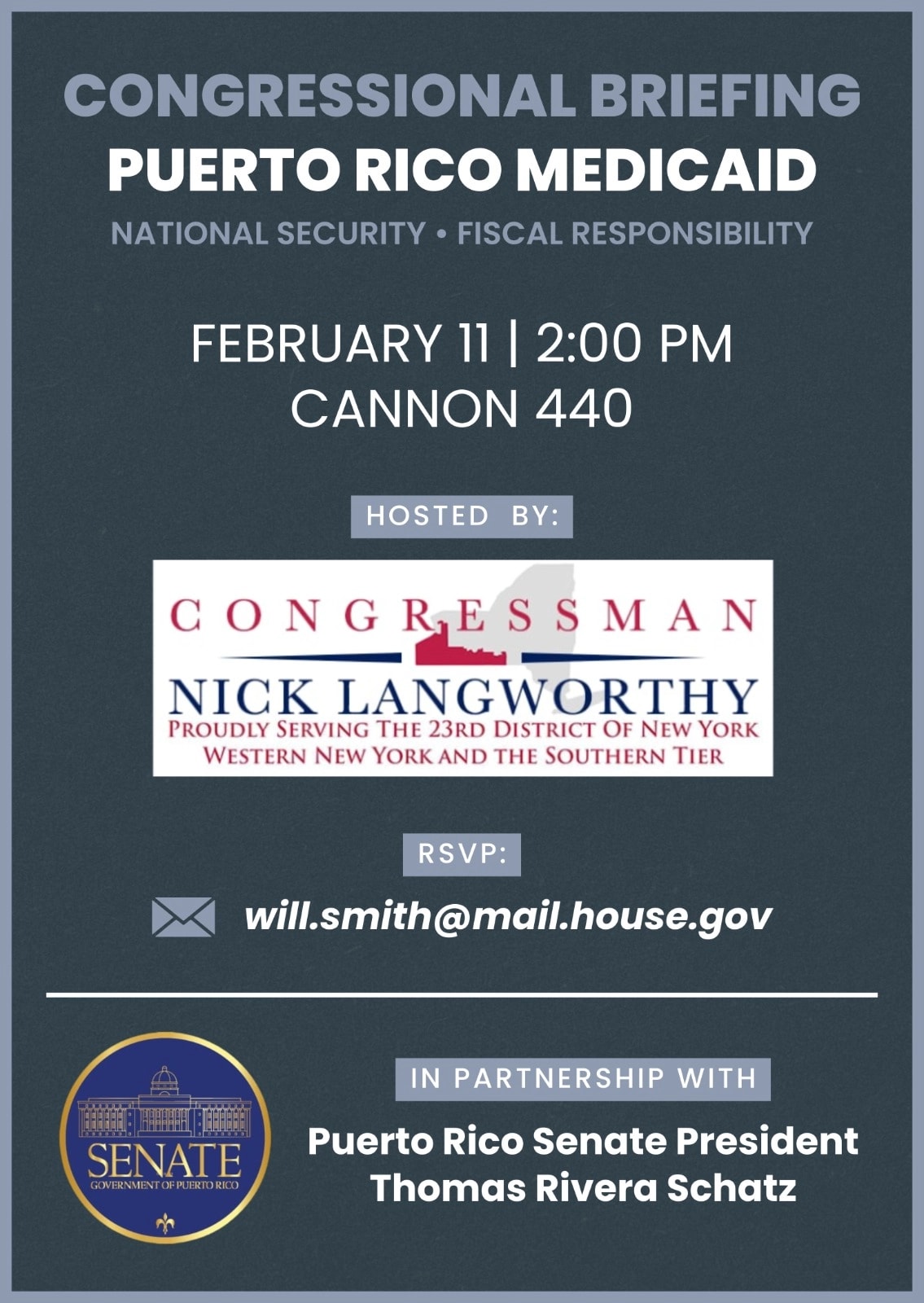 El pasado 11 de febrero, Langworthy y Rivera Schatz organizaron un congressional briefingcongressional briefing en el Congreso sobre el futuro del Medicaid en Puerto Rico. El evento reunió a funcionarios y a líderes del sector de salud en Puerto Rico para discutir las implicaciones del vencimiento del financiamiento extendido y las opciones legislativas disponibles. Igualmente, la Directora de PRFAA Gabriela Boffelli sostuvo una reunión junto al congresista para abordar el tema, junto a los representantes de los centros 330.