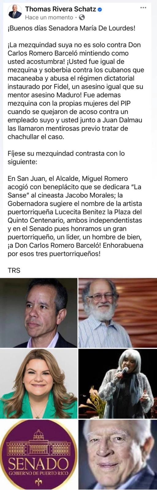 “¡La mezquindad suya no es solo contra Don Carlos Romero Barceló mintiendo como usted acostumbra!”, escribió Rivera Schatz. “¡Usted fue igual de mezquina y soberbia contra los cubanos que macaneaba y abusa el régimen dictatorial instaurado por Fidel, un asesino igual que su mentor asesino Maduro!”.