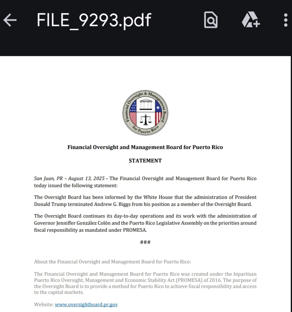 "La Junta de Supervisión ha sido informada por la Casa Blanca que la administración del presidente Donald J. Trump despidió a Andrew G. Biggs de su cargo como miembro de la Junta de Supervisión. La Junta de Supervisión continúa sus operaciones cotidianas y su trabajo con la administración de la gobernadora Jenniffer González Colón y la Asamblea Legislativa de Puerto Rico en las prioridades relativas a la responsabilidad fiscal según lo exige PROMESA", lee el escrito.