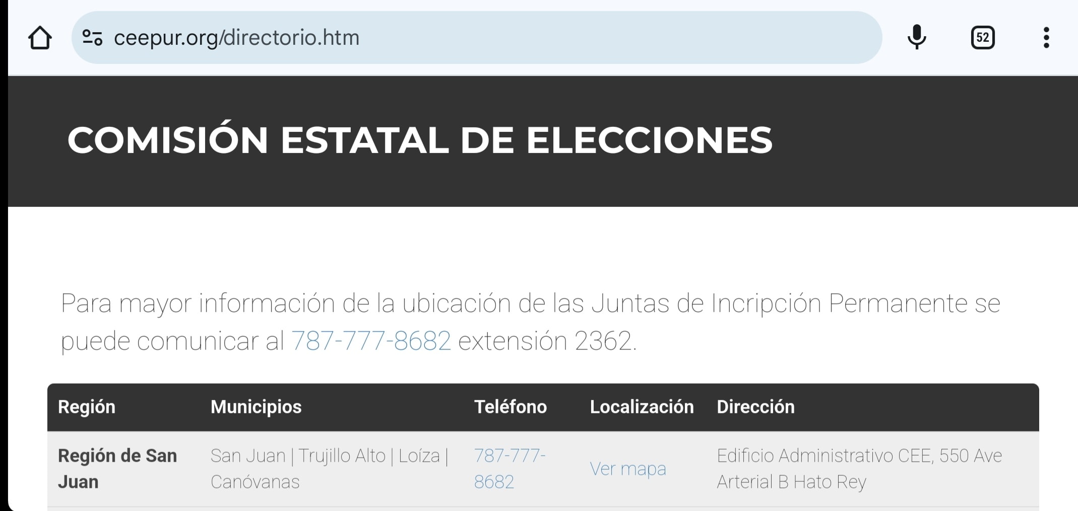 Este medio también intentó sin éxito comunicarse al 787-777-8686, que es el teléfono que la CEE promociona para obtener "mayor información de la ubicación de las Juntas de Incripción (sic) Permanente". Este número es el que más se repite en todos los directorios telefónicos examinados, pues está acompañado de múltiples extensiones que supuestamente están asignadas a la gran mayoría de las 58 juntas, de las cuales 15 son permanentes y 43 temporeras.