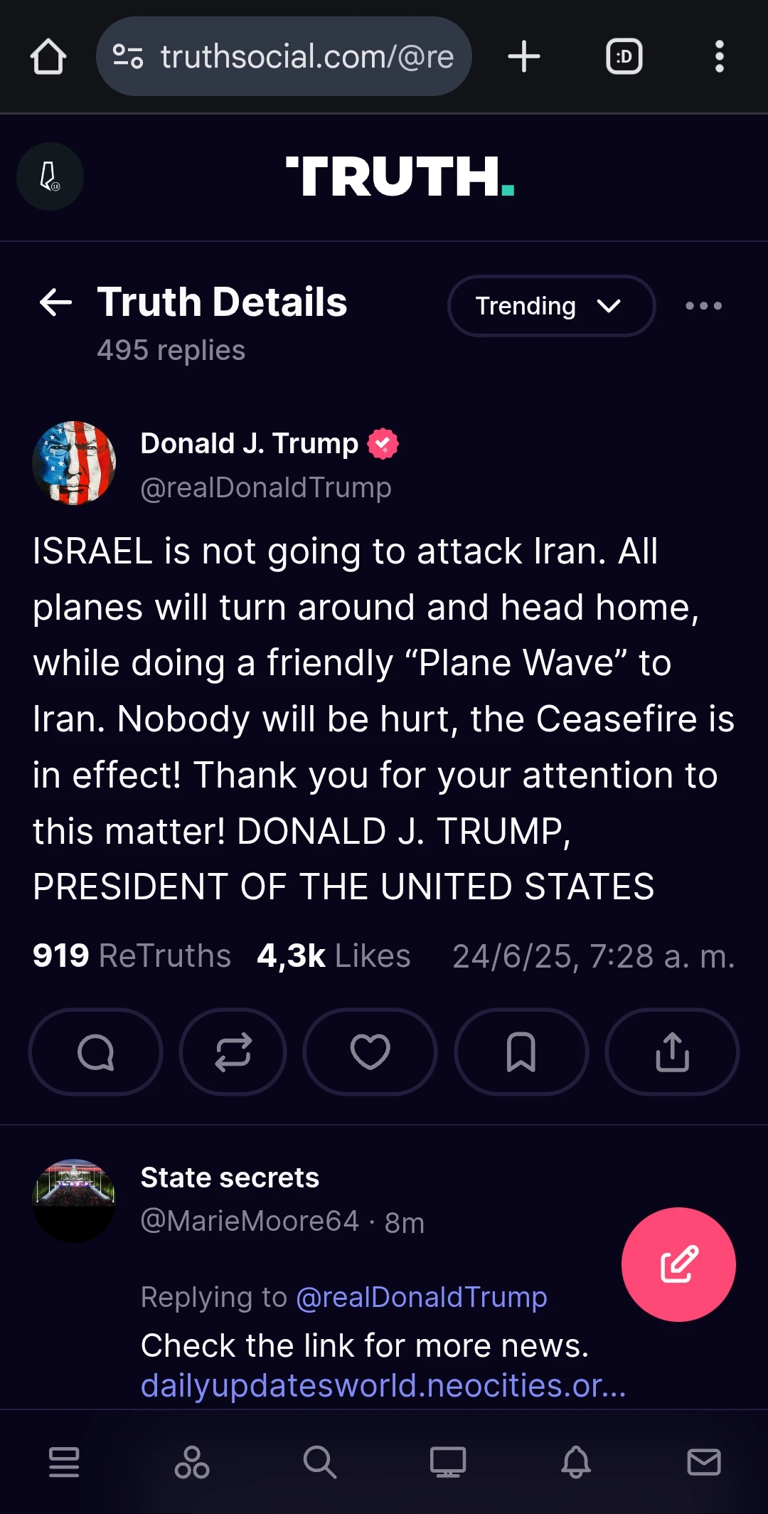 “ISRAEL no va a atacar a Irán. Todos los aviones darán la vuelta y regresarán a casa, mientras hacen un amistoso ‘Plane Wave’ a Irán. Nadie será herido, ¡el alto el fuego está en efecto!”, escribió Trump a las 7:28 a.m. en un tono marcadamente diferente al del minutos anteriores.