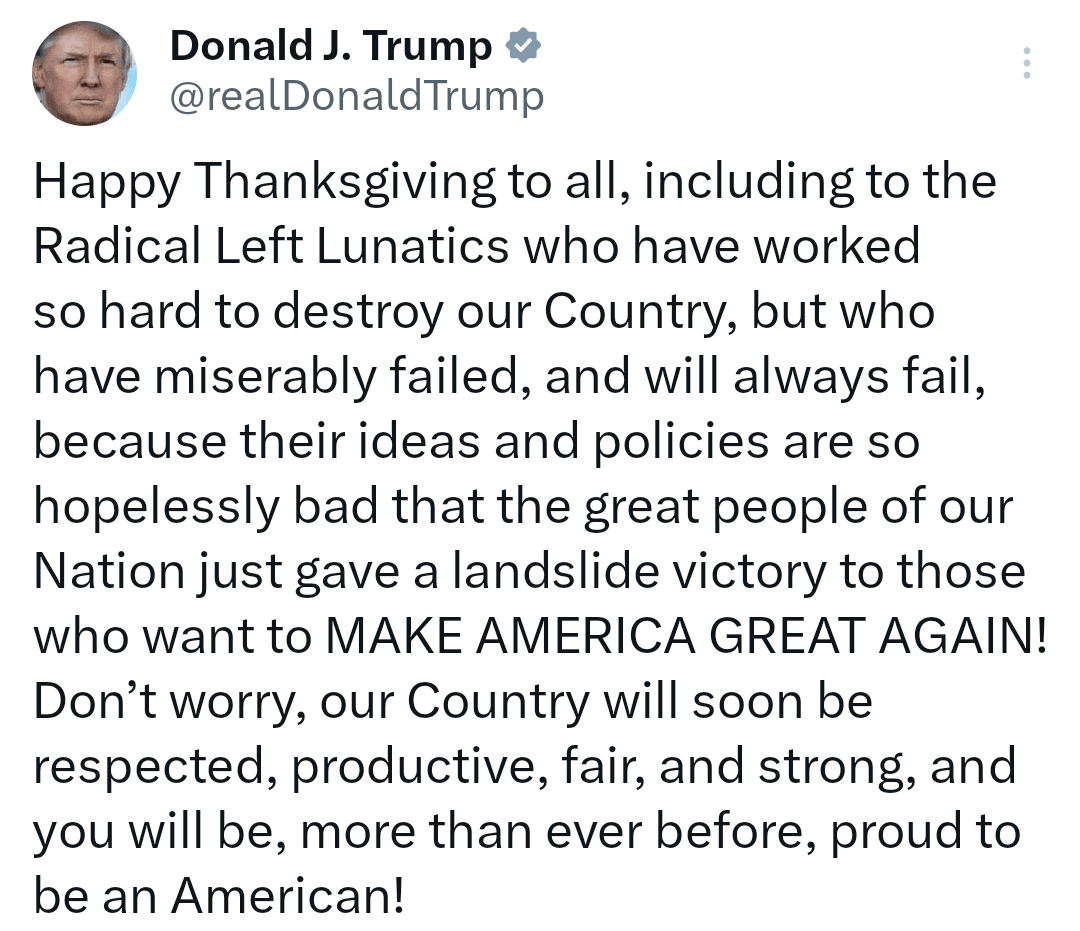 "Happy Thanksgiving to all, including to the Radical Left Lunatics who have worked so hard to destroy our Country, but who have miserably failed, and will always fail," escribió Trump, dejando claro que considera que sus oponentes están destinados al fracaso. El presidente destacó la importancia de su reciente victoria, afirmando que fue una "victoria aplastante" para quienes apoyan su visión de "Make America Great Again".
