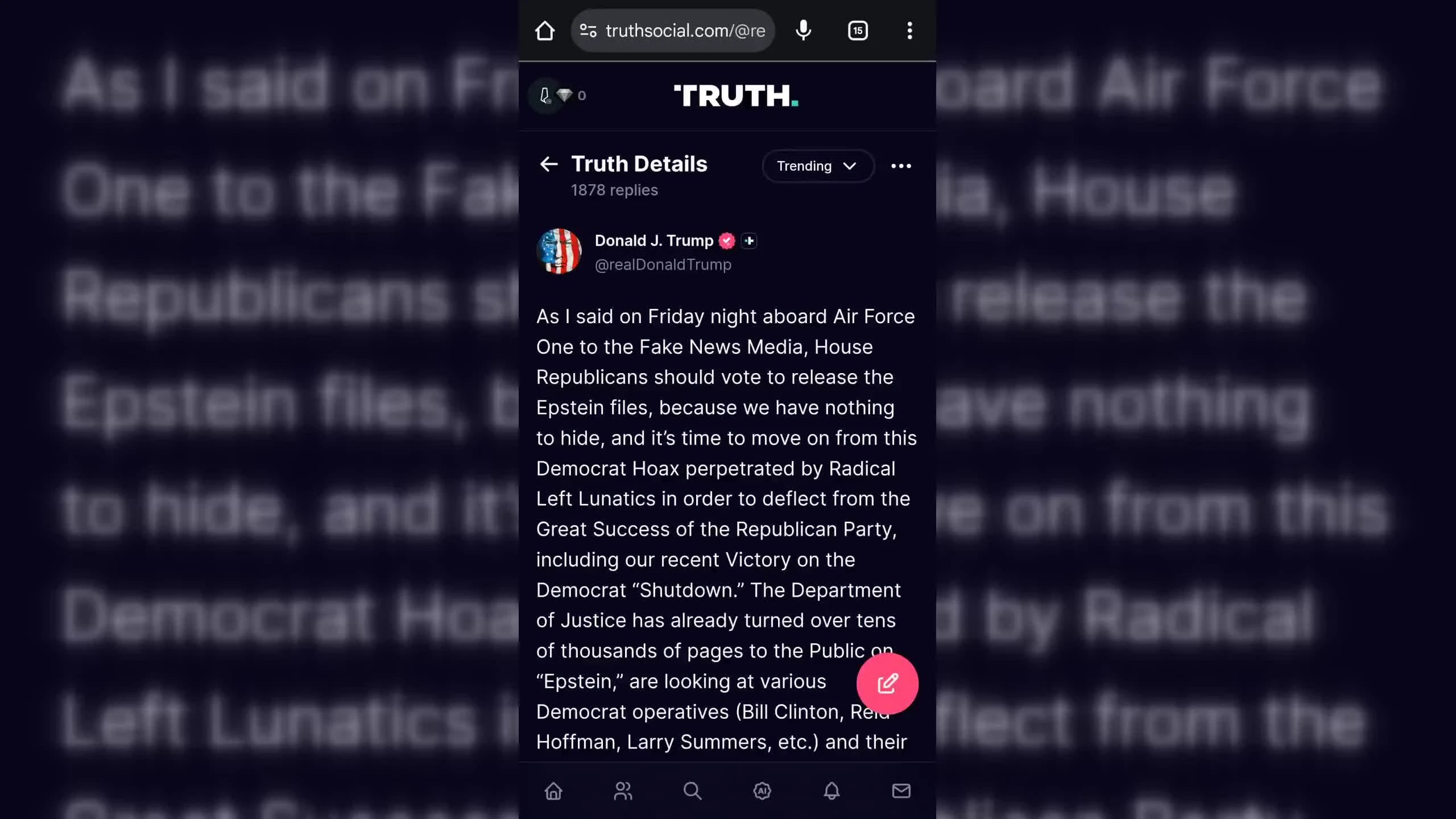 En un mensaje difundido desde su plataforma Truth Social, Trump afirmó que el Departamento de Justicia “ha entregado decenas de miles de páginas al público” relacionadas con el caso Epstein y que la agencia continúa examinando información vinculada a figuras demócratas como Bill Clinton, Reid Hoffman y Larry Summers. Añadió que el Comité de Supervisión de la Cámara puede acceder a cualquier documento al que tenga derecho legalmente.